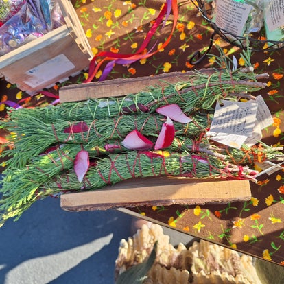 Cedar Mugwort lavender rosemary gently tied in a bundle with rose petals. Aprox 2"×10" .fresh fragrant and can be used as a smudge . Sustainably gathered made with love.